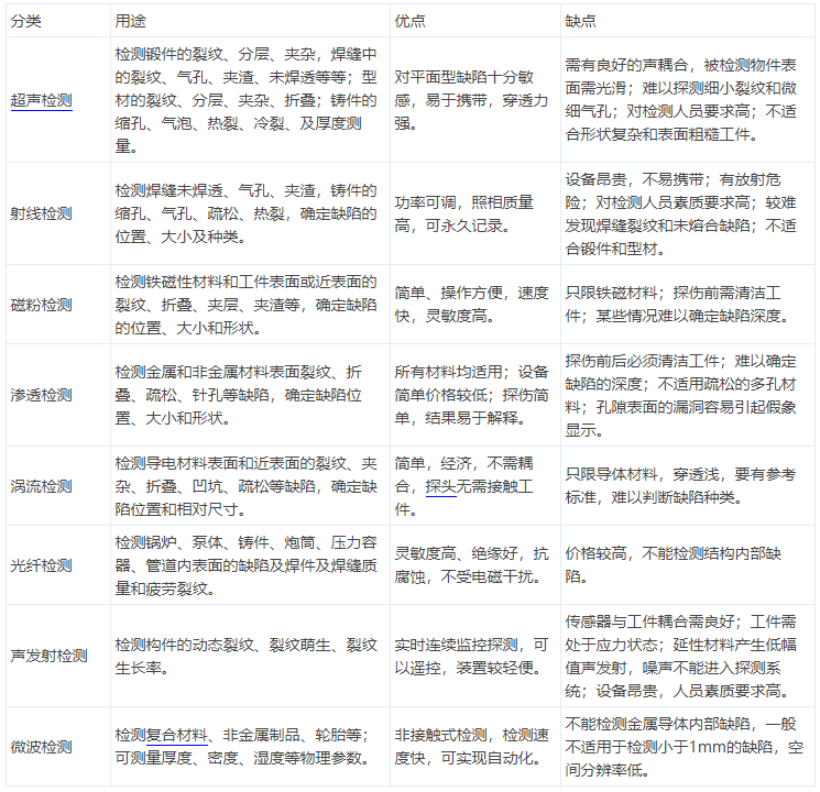 目前實際應用中有很多種無損檢測方式,除了射線、超聲、磁粉、滲透、渦流這五大常規檢測之外,還有微波、聲發射、激光、紅外等等,下面為大家介紹的是幾種常用的無損檢測方式的用途、優缺點。